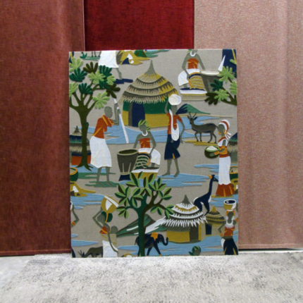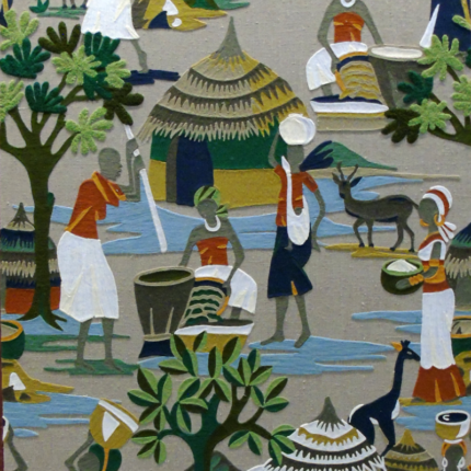 Arazzo da parete in lino, ricamato a mano raffigurante un villaggio africano