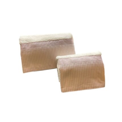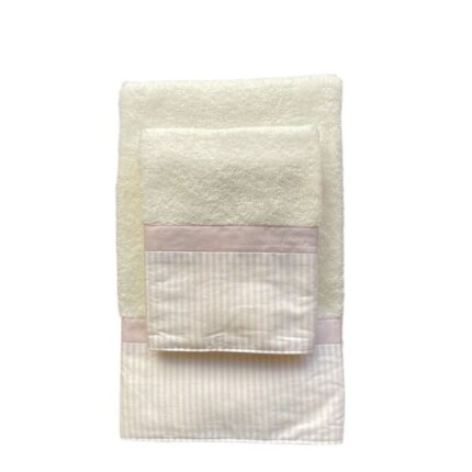 Coppia di asciugamani viso e ospite di spugna colore panna con fascia a righe lilla.